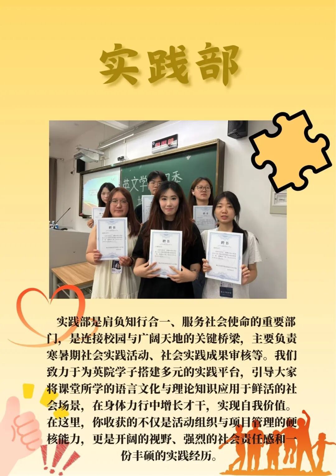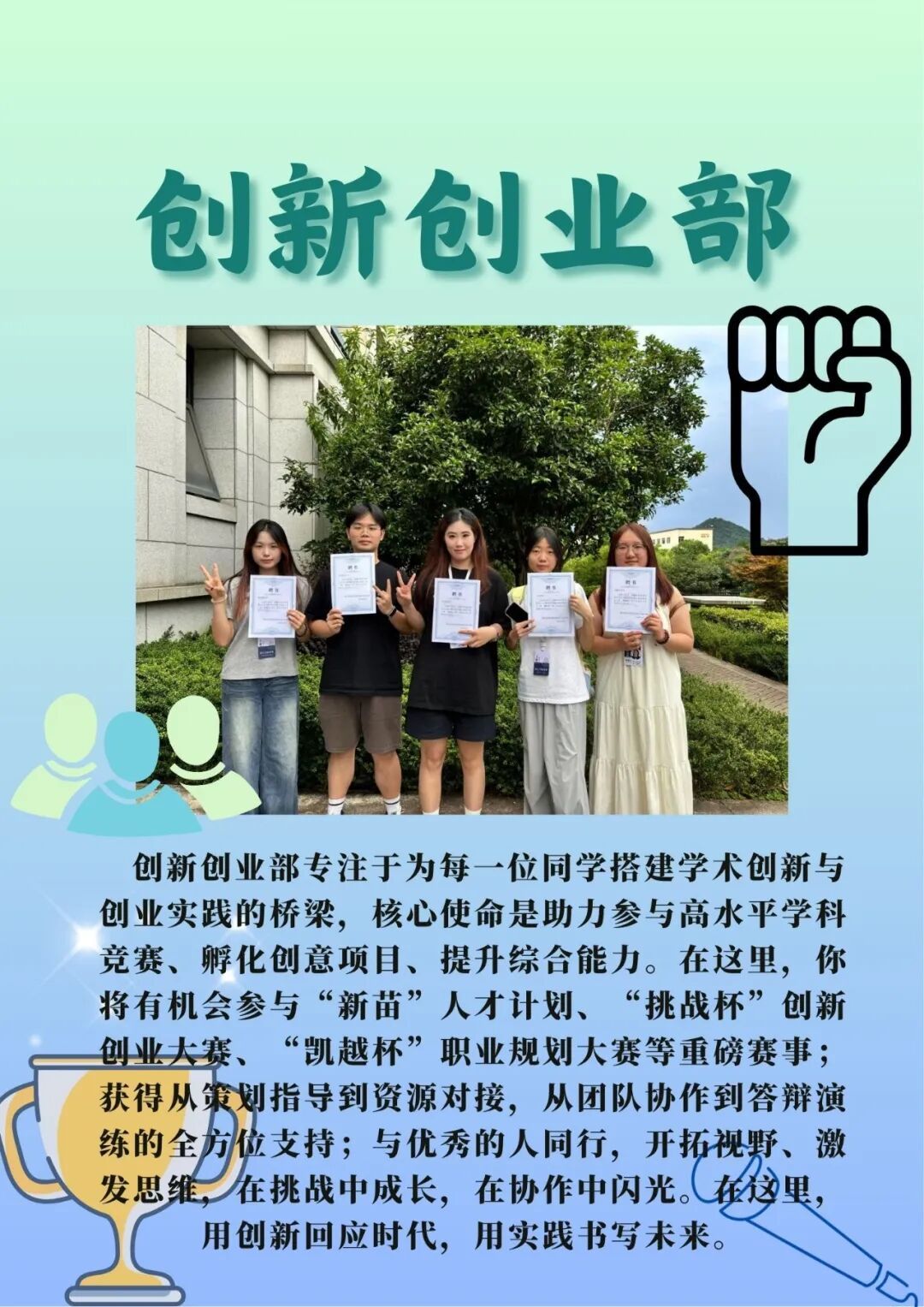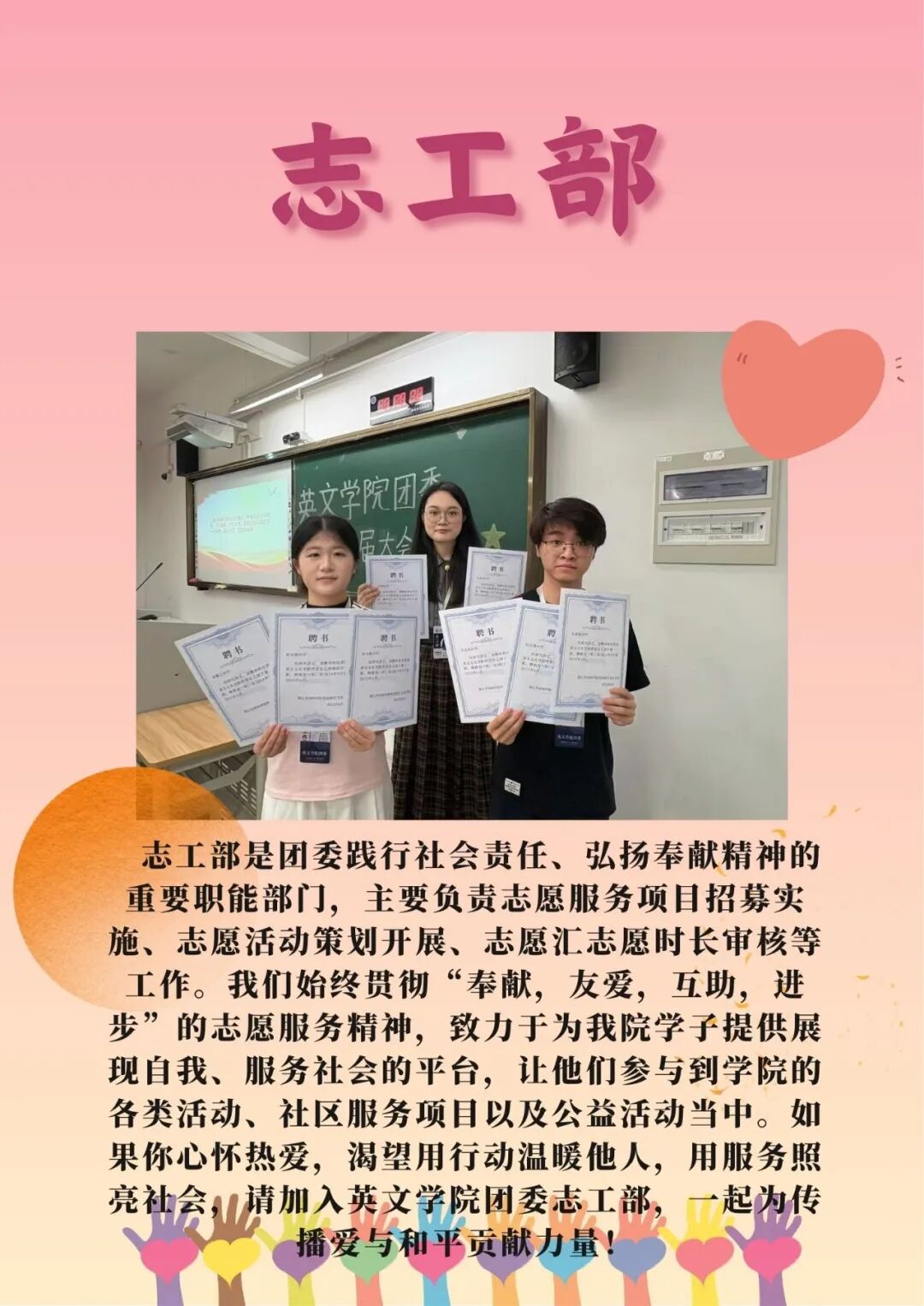 威廉体育团委内设办公室、组织部、宣传部、创新创业部、实践部、志工部六大部门。每个部门各司其职又相互配合,是公司开展团学工作的得力助手。