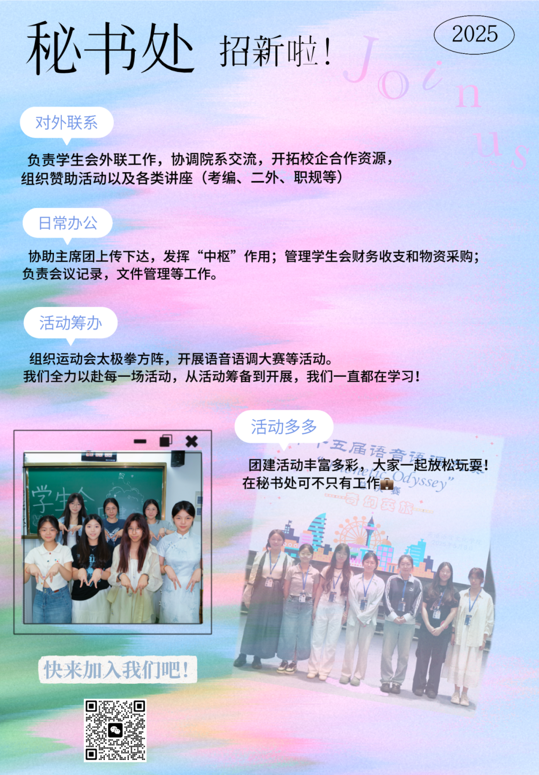 这里,是威廉体育员工会的中枢地带,是协调与沟通的桥梁。秘书处主要负责联系校内外机构,组织拉取赞助。是员工会日常工作的“靠山石”:处理员工会日常事务,协调各部门关系及协助主席团上传下达、内交外联;负责财务管理、会议记录等重要工作。是你施展才干的“演出台”:筹办各类活动,从策划设计到中控场控,为广大学子提供丰富多彩的校园生活!