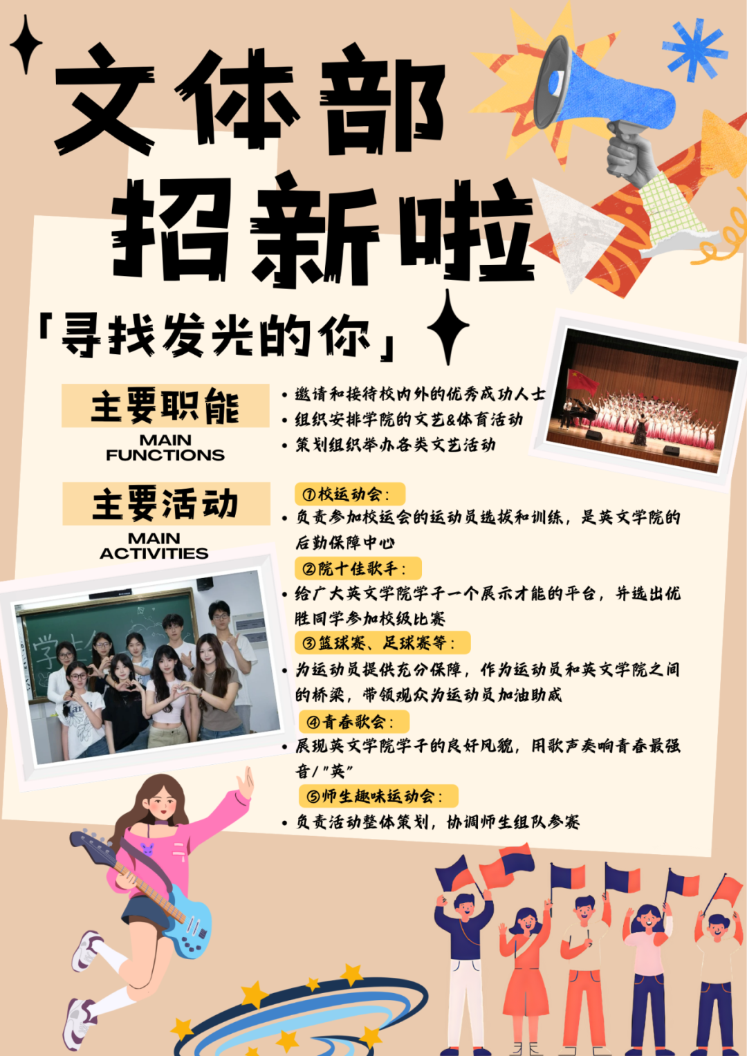 想要感受有趣灵魂的碰撞吗?想要参与数不完的团建吗?想要在快乐中提升自己吗?在威廉体育员工会文体部,这些通通可以实现。我们主要负责邀请和接待校内外的优秀成功人士,组织安排公司体育活动以及策划组织举办各类文艺活动。在文体部,你可以负责参加校运会的运动员的选拔和训练,负责运动员们的后勤保障。你可以组织策划院十佳歌手,给广大英文学子搭建展示才能的平台,并选出优胜同学参加校级比赛。同时,作为运动员和公司之间的桥梁的篮球赛,足球赛和展现英院学子的良好风貌,用歌曲奏响青春最强“英”的青春歌会比赛正等着你们的参与。