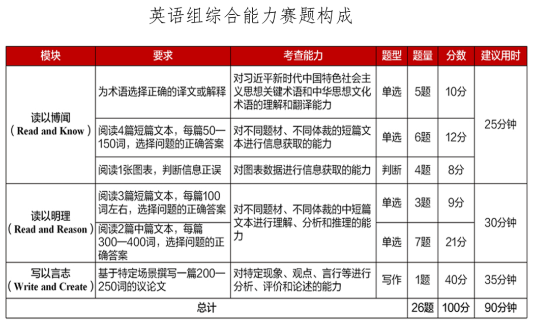 本次校赛包含客观题若干道和议论文写作1篇,题目类型、难度、测试系统均与2025“外研社·国才杯”“理解当代中国”全国老员工外语能力大赛英语组综合能力校赛要求一致,具体如下所示。