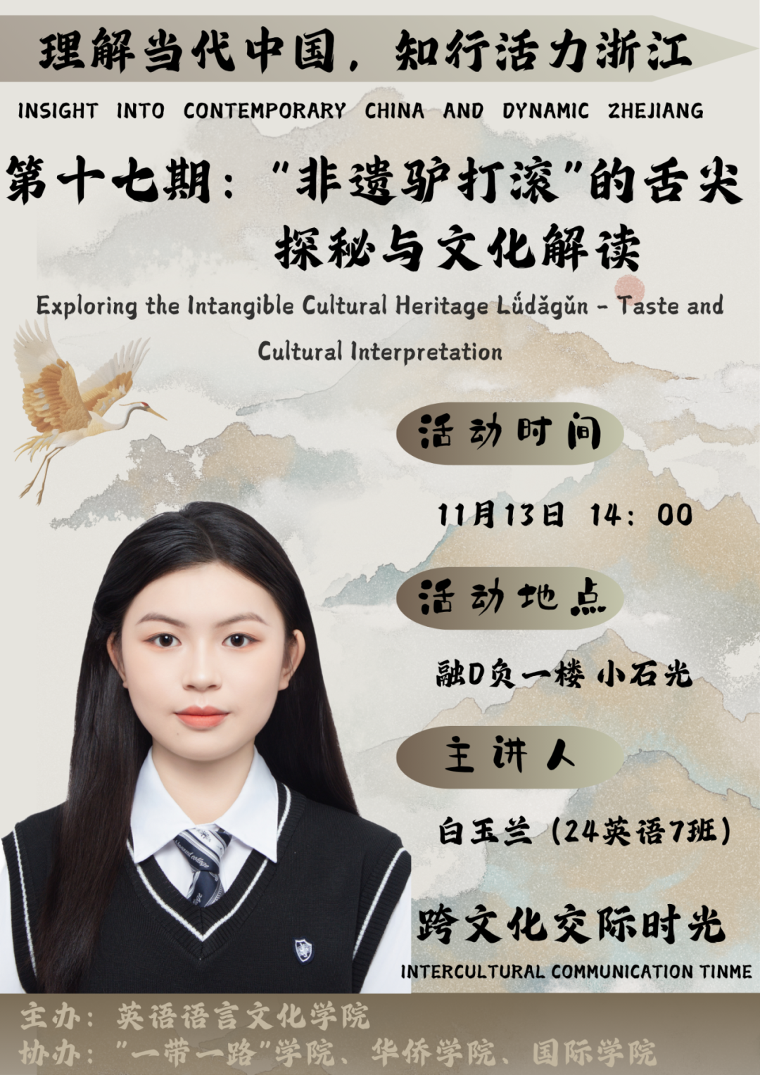 新一期跨文化交际活动将于11月13日举办,本期活动主题为“‘非遗驴打滚’的舌尖探秘与文化解读”(Exploring the Intangible Cultural Heritage Ludăgun-Taste and Cultural Interpretation)。驴打滚,这一传统的中式甜品,不仅仅是一道美味,更是中国非物质文化遗产的代表之一,承载着丰富的历史文化内涵。在本期活动中,由白玉兰作为主讲人,带领大家一同走进驴打滚的世界,从原料选择到制作工艺,从历史渊源到文化象征,全方位解读这道非遗美食的独特魅力。