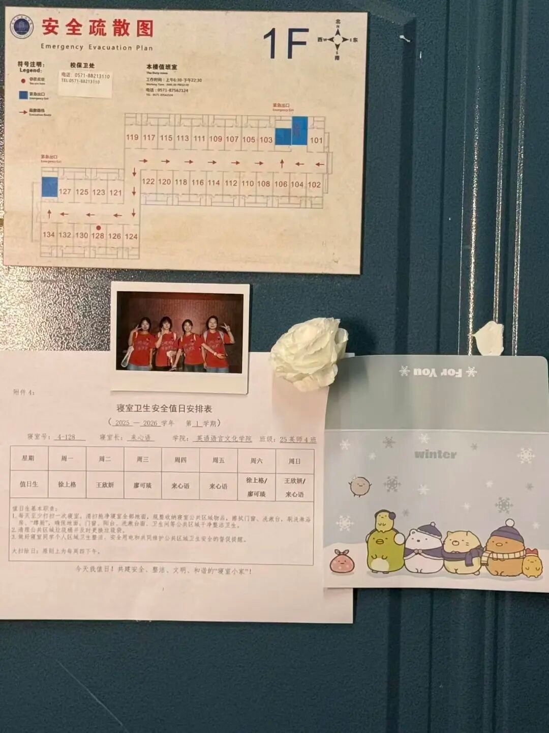 一隅天地,蕴浙外学子万卷风华。于柜门上,消防用电的温馨贴士筑牢安全防线。方寸桌前,英文单词、学习目标彰显逐梦轨迹,张张旧照片又将过往温暖回忆珍藏于心。我们在方寸寝室里,洋溢着独属