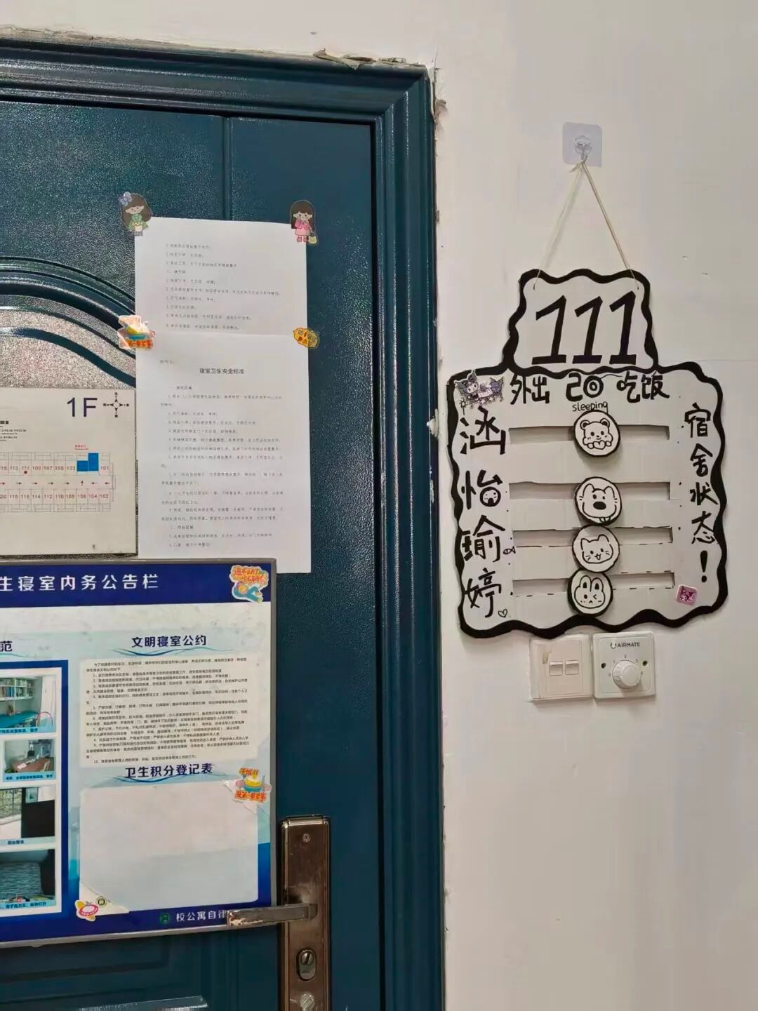 128是我们的温馨小窝:上下铺旁挂着软乎乎的衣被,书桌角落挤满可爱摆件,窗畔晒着生活气息的衣物,门上还有定期更换的鲜花。虽简约却满是暖意,是疲惫时的治愈港湾,藏着我们的日常小欢喜。
