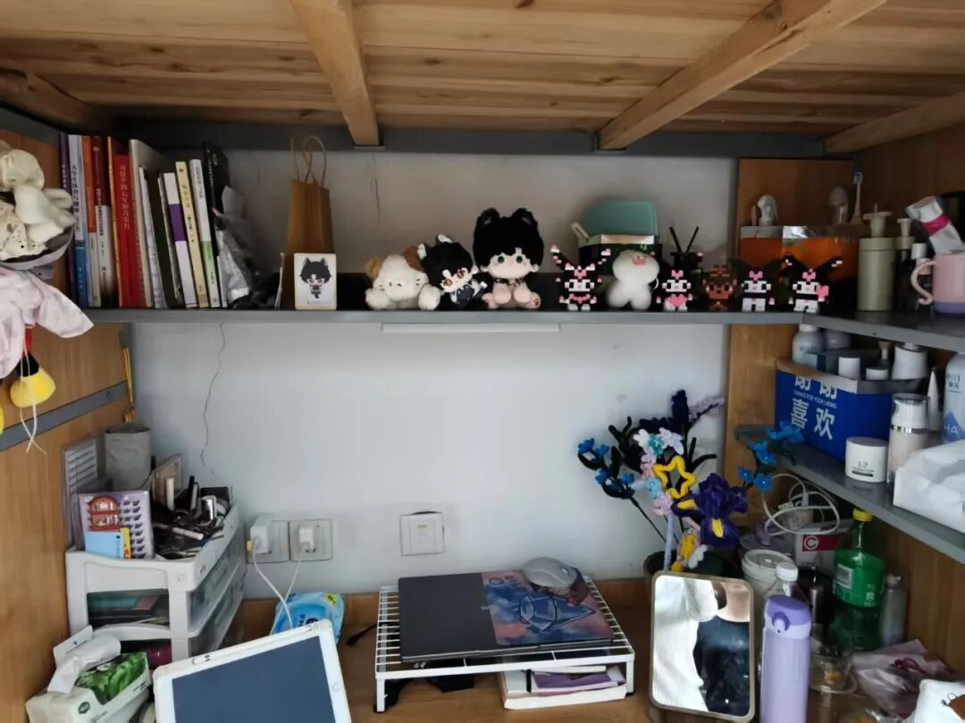 我们走的是简约风。宿舍内物品摆放整齐,地面干爽洁净,屋子宽敞明亮。为了增添生活气息,我们养了些绿植,寝室的女孩们还为宿舍配备了除湿机与香薰机。个人空间内,我们各自用自己喜欢的元素装饰桌面与柜子,让宿舍温馨又舒适。