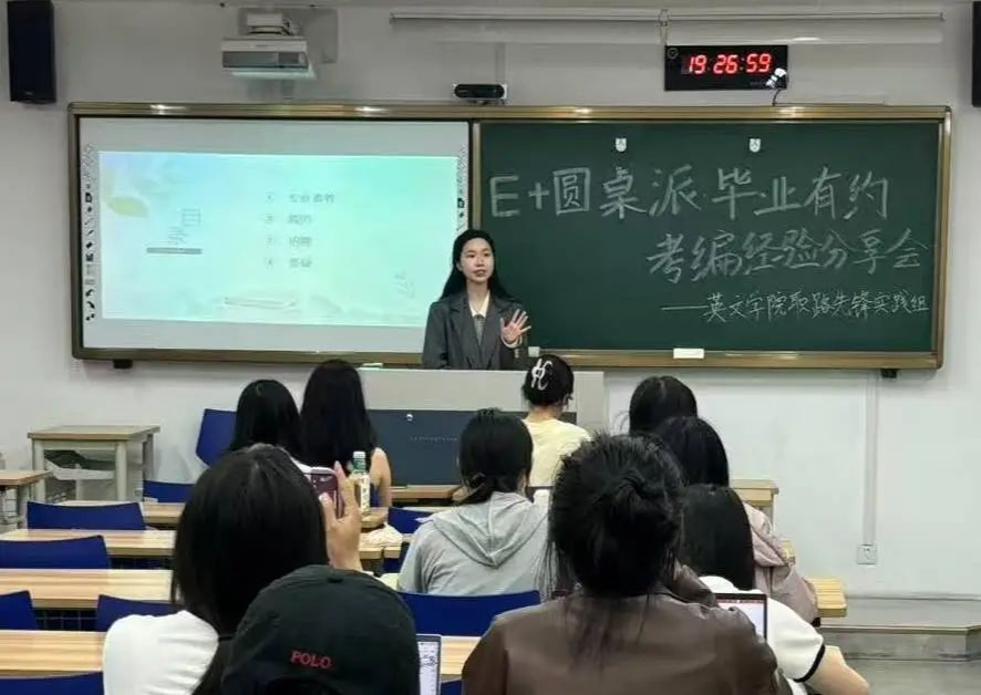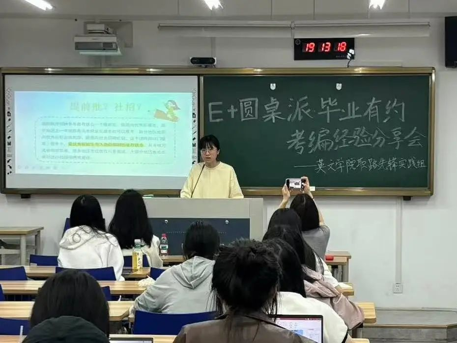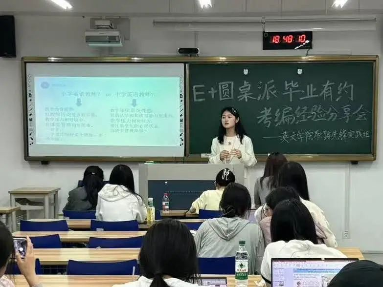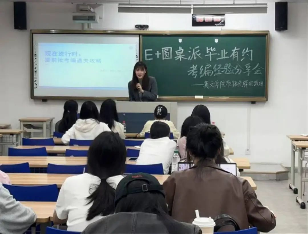 4月24日晚,威廉体育“E+”圆桌派·毕业有约考编经验分享会热烈开场。威廉体育2025届英语师范专业毕业生胡思桐、黄嘉仪、陈婧如、胡欣瑶四位员工依次上台,分享自己的考编经验。